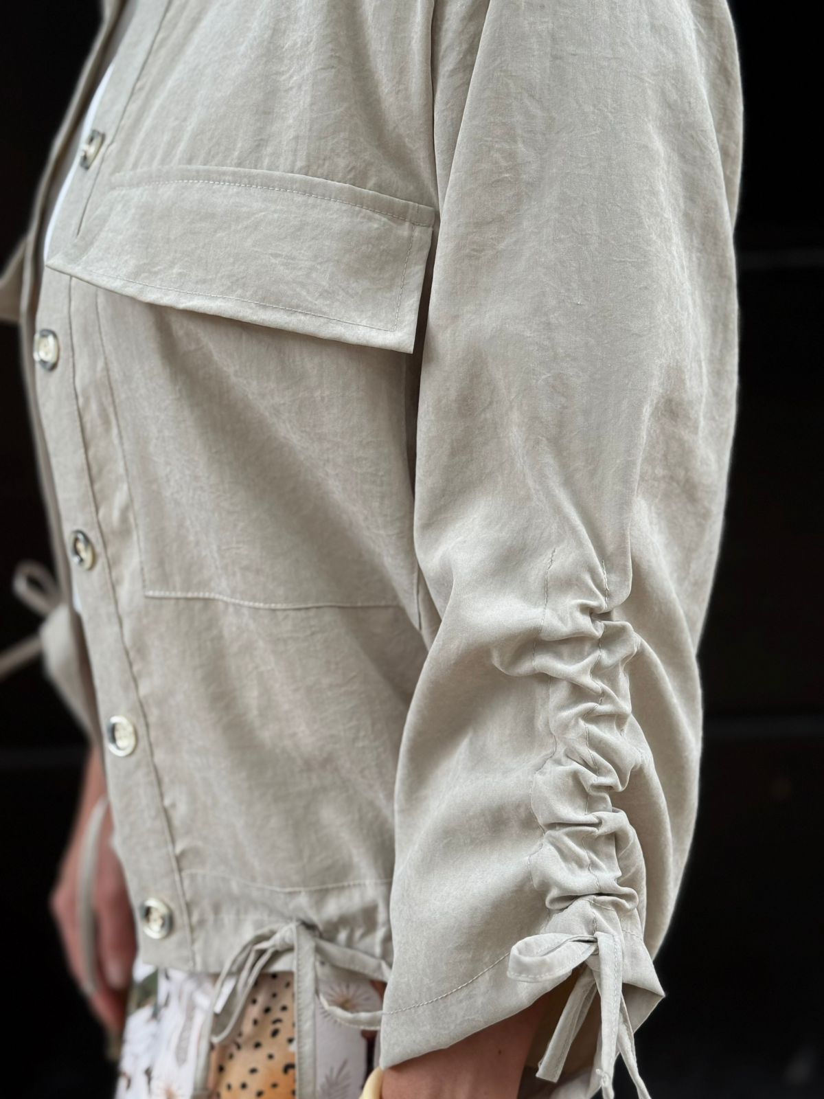 Elaborada en tela de tacto suave y tecnología antifluido, recogido en manga y cintura graduable, cuello neru, bolsillos parte frontal.