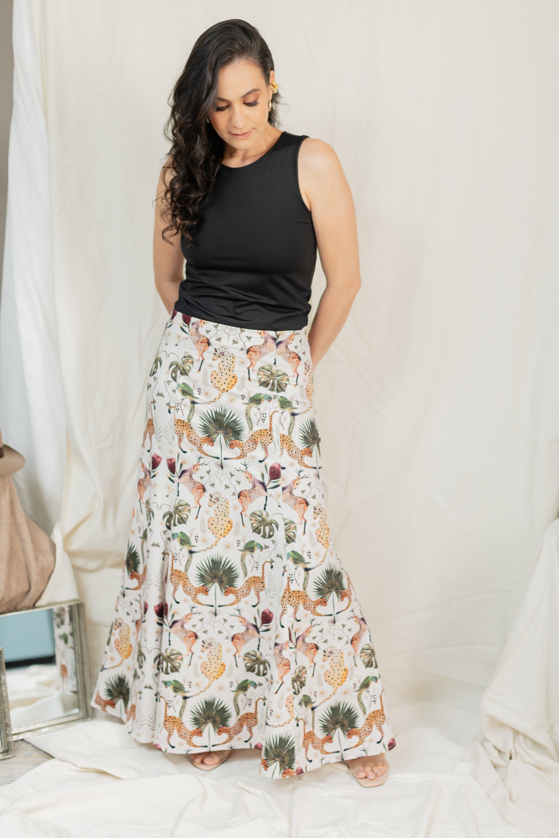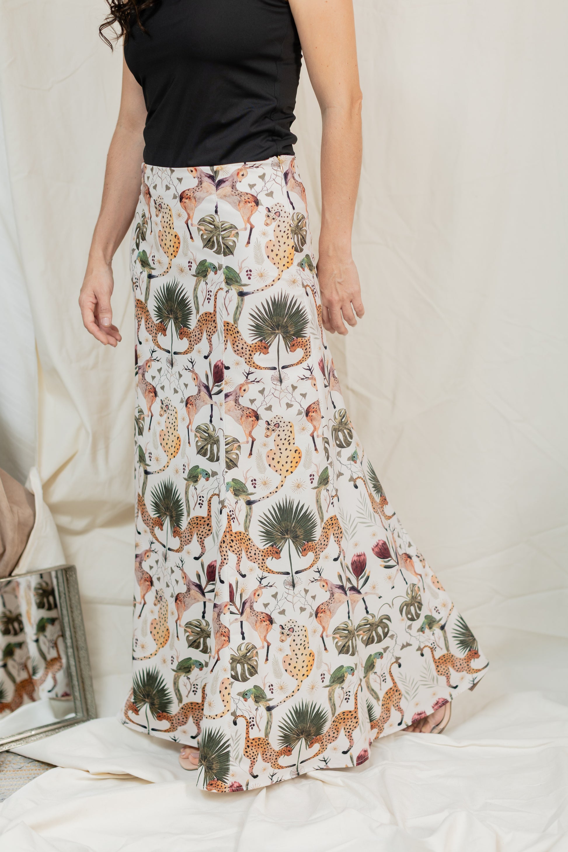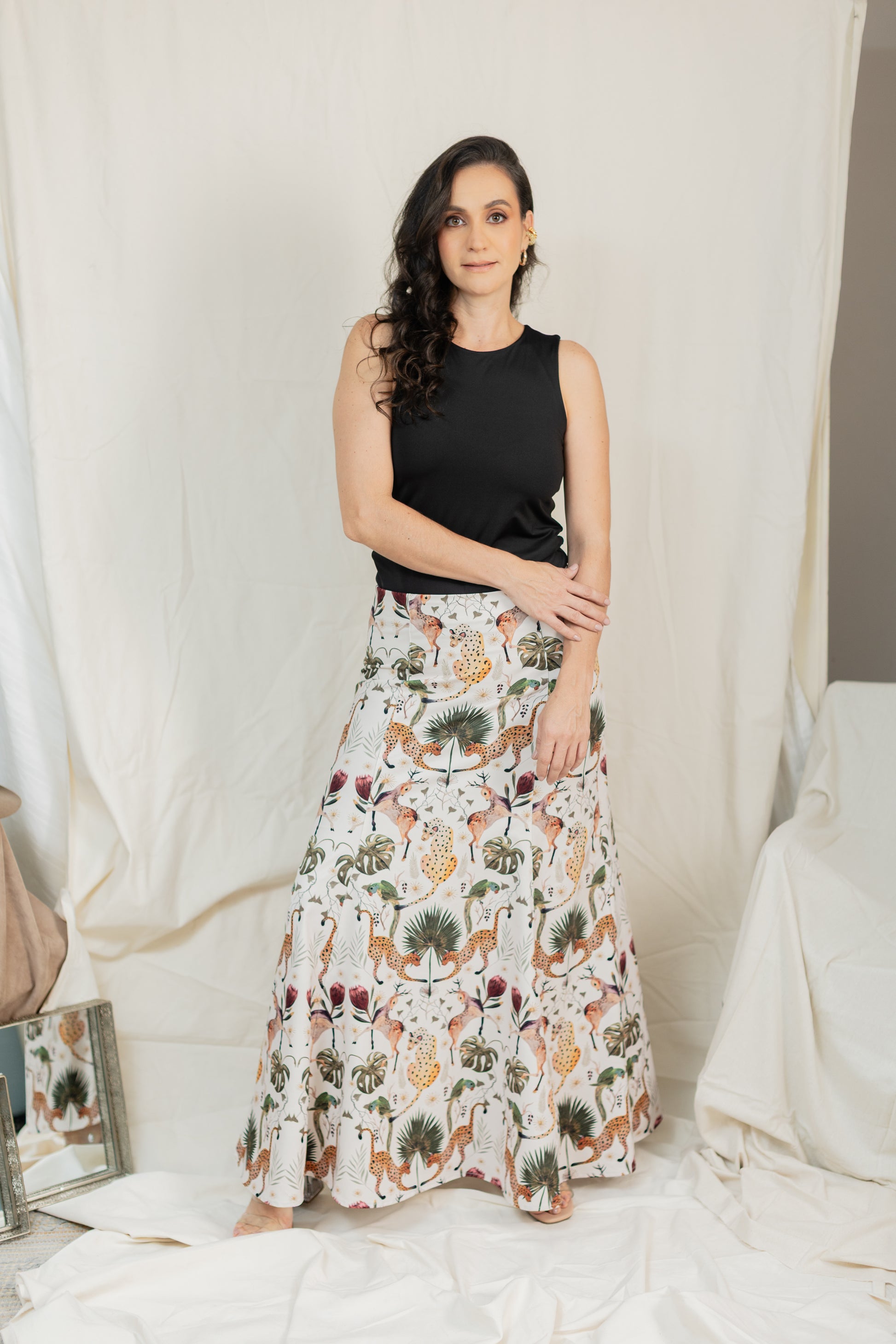 Falda elaborada en poli nailon un una combinación de telas super ligera y cómoda, corte sirena con corte negas, su estampado es exclusivo de la marca inspirado en la naturaleza, cierre lateral, su material garantiza seguridad y confort.