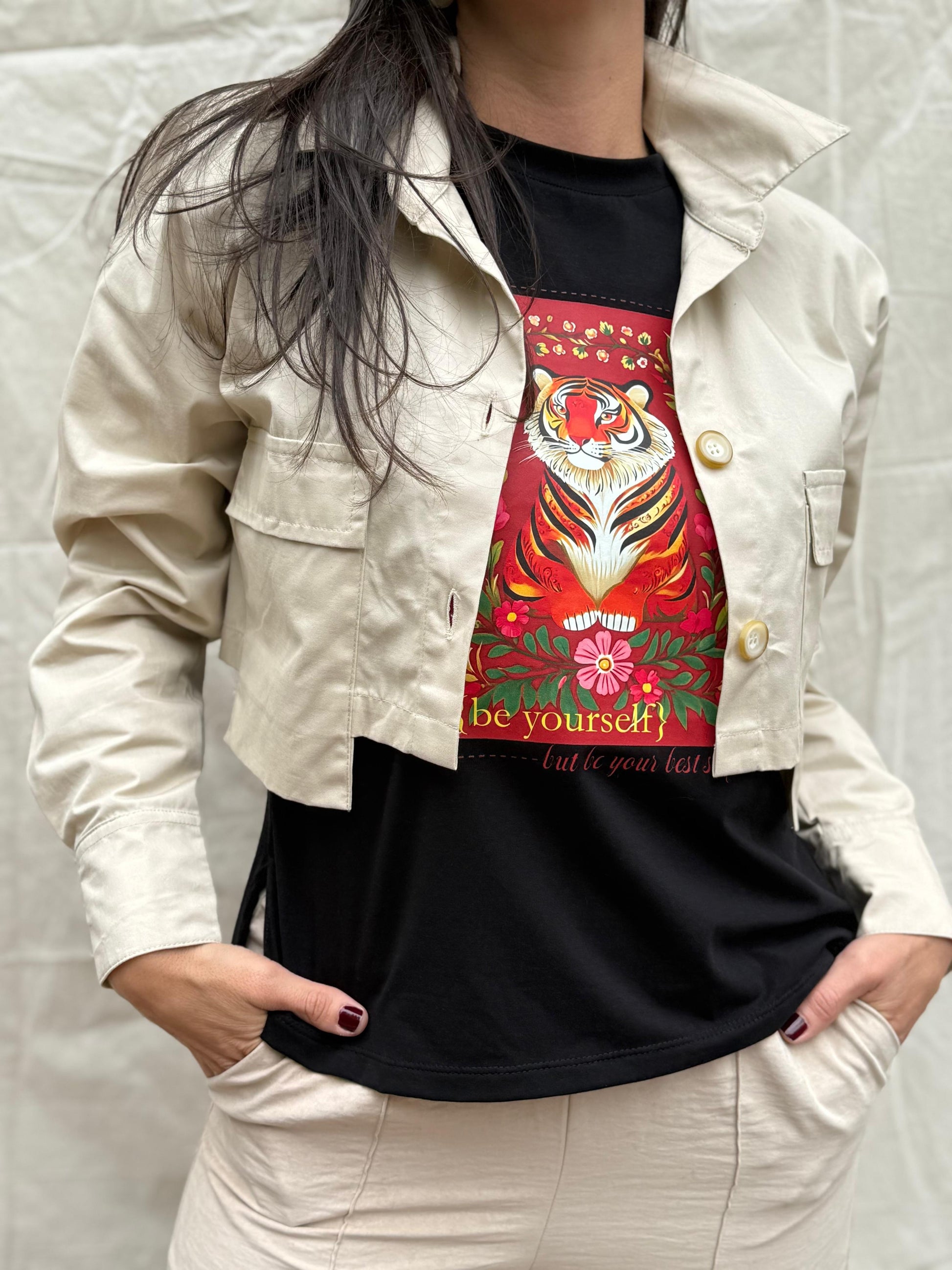Hermosa Tshirt en algodón spandex. Tiene estampación en frente multicolor y detalle en sus mangas de dobladillo. Su tela es suave al tacto. Es una tshirt muy cómoda y versátil.